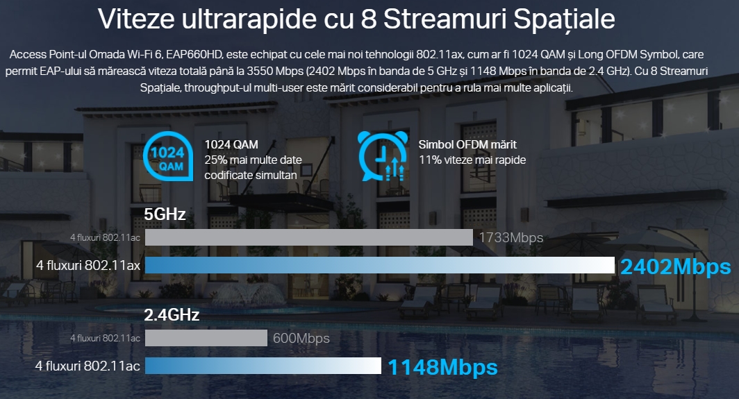 - Viteze Wi-Fi 6 ultrarapide: Conexiuni simultane de până la 1148 Mbps în banda de 2.4 GHz și 2402 Mbps în banda de 5 GHz, oferind astfel o viteză totală de 3550 Mbps