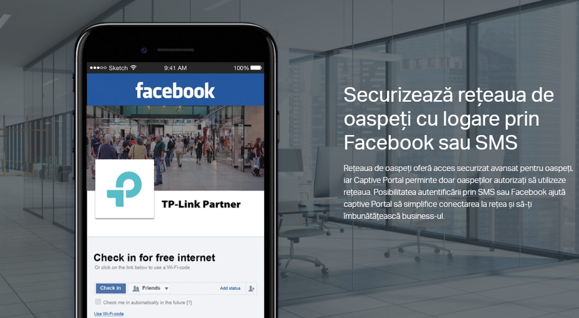 - Rețea vizitatori securizată: Ai mai multe opțiuni de autentificare (SMS/Facebook Wi-Fi/ Voucher, etc.) și mai multe tehnologii de securitate wireless