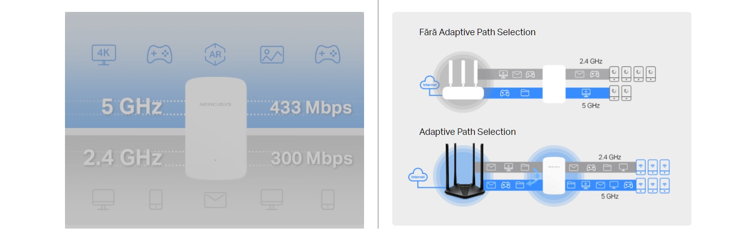 ME20 mentine mai multe dispozitive conectate simultan prin dual band. Foloseste banda de 2.4 GHz pentru a trimite un email si pentru a naviga pe internet si banda de 5 GHz pentru gaming si streaming HD.
