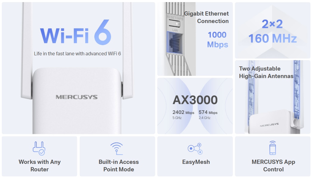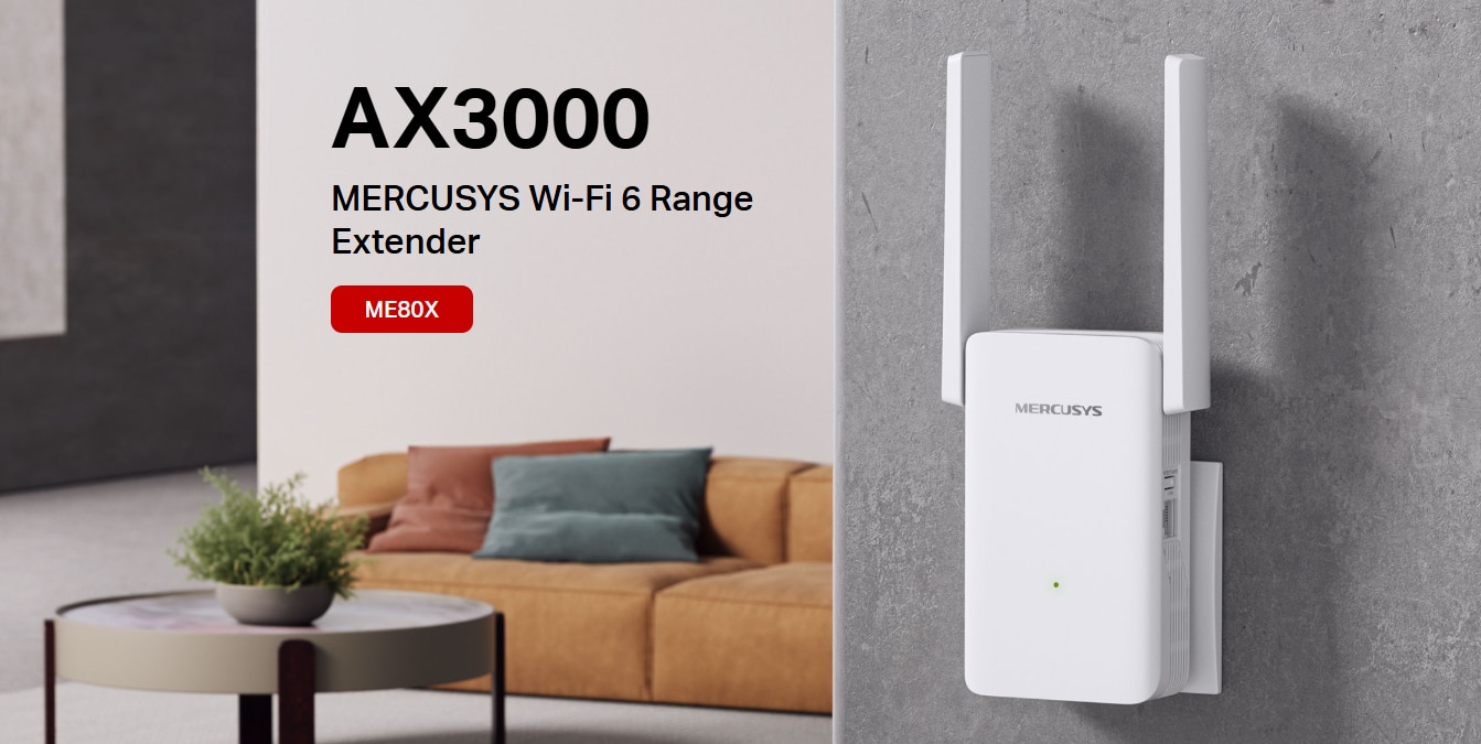 Descrierea produsului Range Extender Mercusys ME80X, AX3000, Wi-Fi 6 Dual-Band, port Gigabit