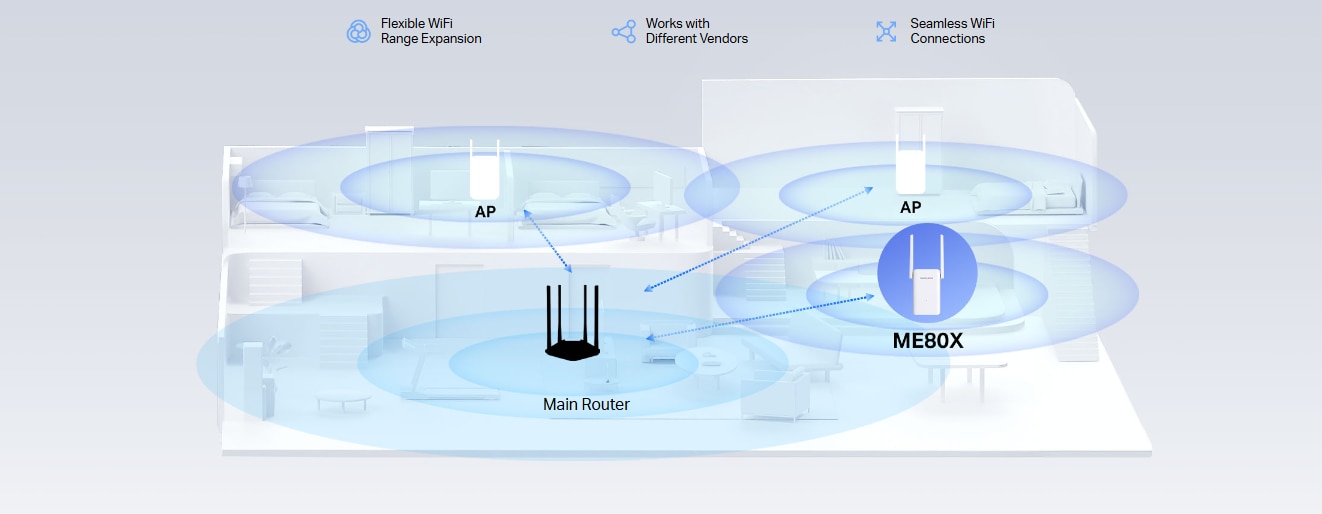 ME80X este compatibil cu EasyMesh, permitandu-va sa configurati o retea mesh pentru intreaga casa cu un singur nume si o singura parola WiFi, impreuna cu orice alte puncte de acces care accepta EasyMesh de la mai multi furnizori. Bucurati-va de o retea WiFi mesh flexibila, scalabila si fara intreruperi in intreaga casa!
