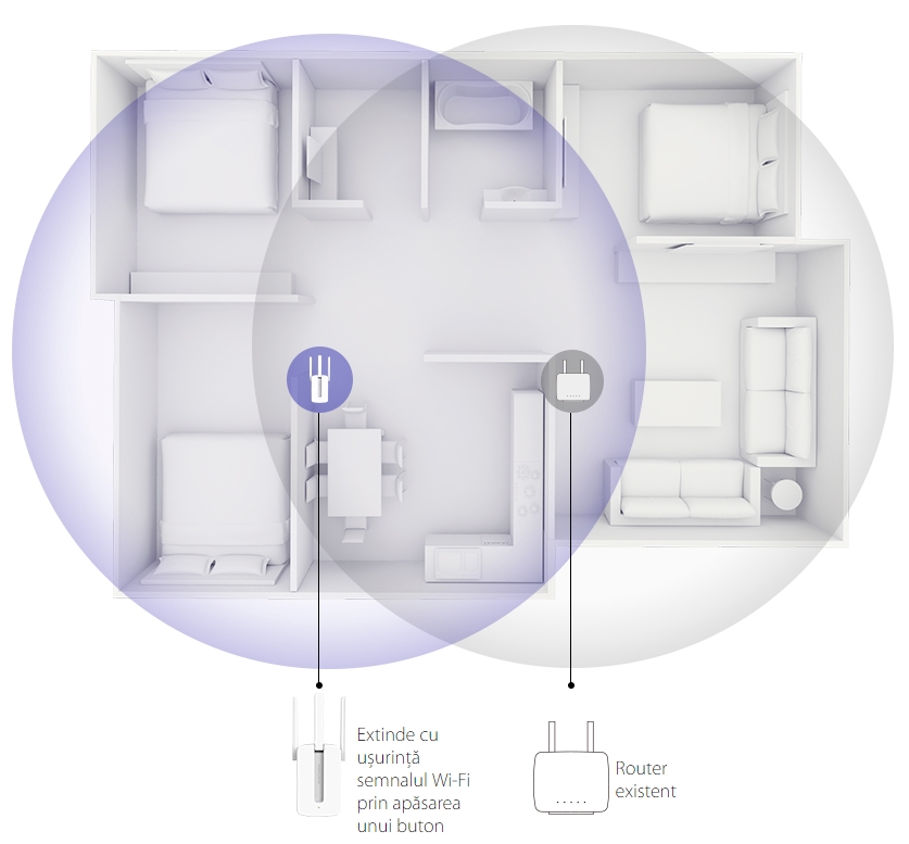 Apasă butonul WPS de pe router și cu MW300RE te poți conecta la rețea în câteva secunde. Odată configurat, poți muta range extender-ul într-o altă locație pentru a obține cea mai bună calitate și acoperire a semnalului în casă, fără a mai fi nevoie să configurezi din nou extensia.