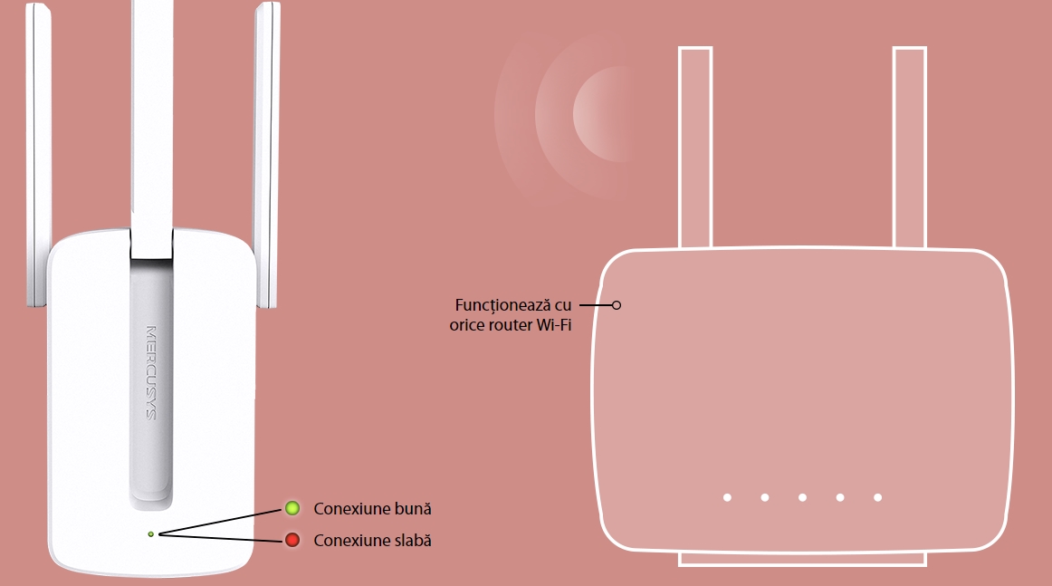 MW300RE funcționează cu orice router Wi-Fi.