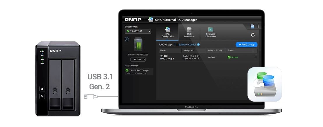 Comparat cu alte carcase RAID, TR-002 ofera configuratii controlate de software pentru o mai mare flexibilitate in management. Utilizatorii pot configura RAID si monitoriza starea de sanatate a discurilor utilizand Manager de stocare si instantanee pe un QNAP NAS sau prin utilizarea utilitarului QNAP External RAID Manager pe computerul lor.