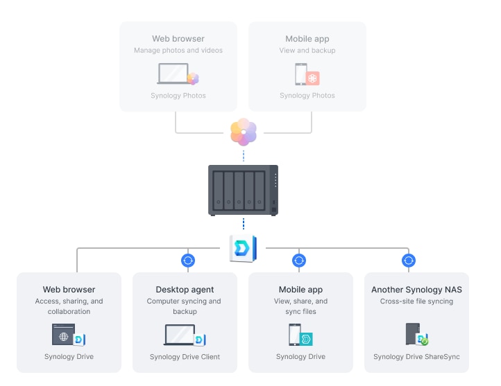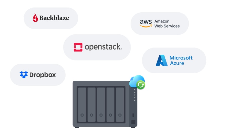 Pastrati automat datele sincronizate intre Synology NAS si principalii furnizori de cloud, inclusiv BackBlaze B2, Dropbox, Google Drive si Microsoft OneDrive. Suportul pentru mai multe protocoale, criptarea pe partea de client si controalele de sincronizare si latime de banda personalizabile permit gestionarea eficienta a stocarii pe diverse platforme.