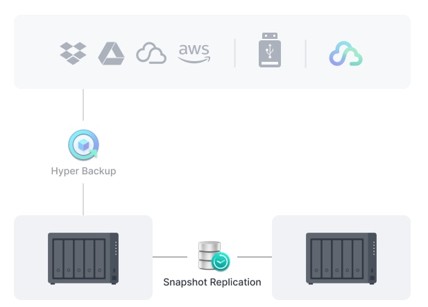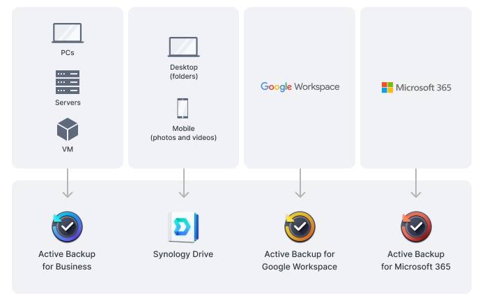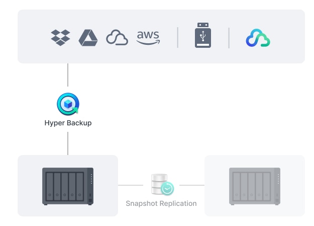 Protejati toate datele, aplicatiile si configuratiile de pe sistemele Synology cu backup-uri programate complete, inclusiv backup-uri bare-metal, catre servere locale si de la distanta, unitati externe sau destinatii de stocare in cloud, inclusiv Synology C2 Storage
