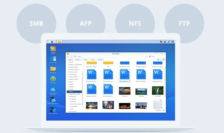 File Station este un instrument de gestionare rapid si sigur bazat pe web, creat pentru a permite operatiuni usoare de drag-and-drop fara a fi necesara nicio configuratie complexa pe Mac sau PC. Instrumentele avansate de cautare si filtrare permit organizarea usoara si partajarea de fisiere. Pentru o compatibilitate completa, DS620slim accepta urmatoarele protocoale: AFP, FTP, iSCSI, NFS, SMB si WebDAV.