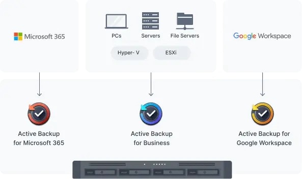 Protectie Endpoint, VM si NAS/SAN Efectuati in siguranta copii de siguranta pentru endpoint-uri Windows si Linux, servere Synology si masini virtuale VMware® si Hyper-V® cu Active Backup for Business. Microsoft 365 si Google Workspace Centralizati copiile de rezerva ale datelor Microsoft 365 si Google Workspace pentru a le proteja impotriva accidentelor si pentru a simplifica conformitatea cu politicile de pastrare a datelor. Copiile de rezerva programabile, versiunea flexibila a fisierelor si deduplicarea la nivel de bloc asigura flexibilitate si economii in ceea ce priveste consumul de spatiu de stocare si latime de banda. | ![]() |