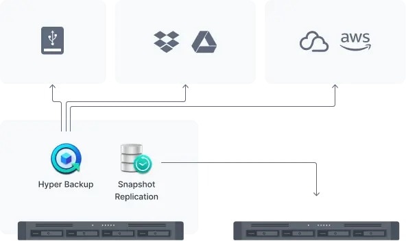 Hyper Backup Efectuati copii de rezerva ale fisierelor, LUN-urilor, aplicatiilor instalate si configuratiilor de sistem catre destinatii care includ Synology C2 Storage5, platforme de cloud public, dispozitive USB, servere de fisiere, foldere locale sau alte sisteme Synology. Setati si uitati de sarcinile de backup cu programari regulate, imbunatatiti securitatea cu permisiuni granulare ale utilizatorilor si criptare, pastrati dimensiunile de backup mici cu deduplicarea incorporata si restaurati datele in mod flexibil cu multi-versiune. Replicarea instantanee Replicarea instantanee permite realizarea de instantanee configurabile in timp a folderelor partajate si a stocarii VM cu un RPO de doar 5 minute si o recuperare in cateva secunde. | ![]() |