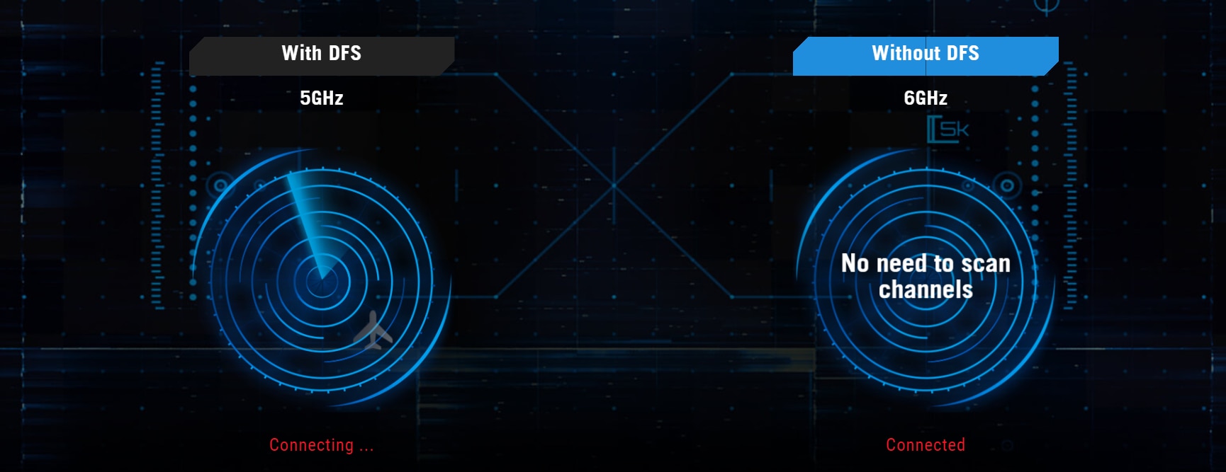Deoarece noua banda de 6GHz este rezervata exclusiv dispozitivelor WiFi 6E, nu este nevoie de selectia dinamica a frecventei, ceea ce previne interferentele cu radarele de control al traficului aerian. Acest lucru inseamna ca dispozitivele se pot conecta mai repede, fara intarzierile impuse de DFS.