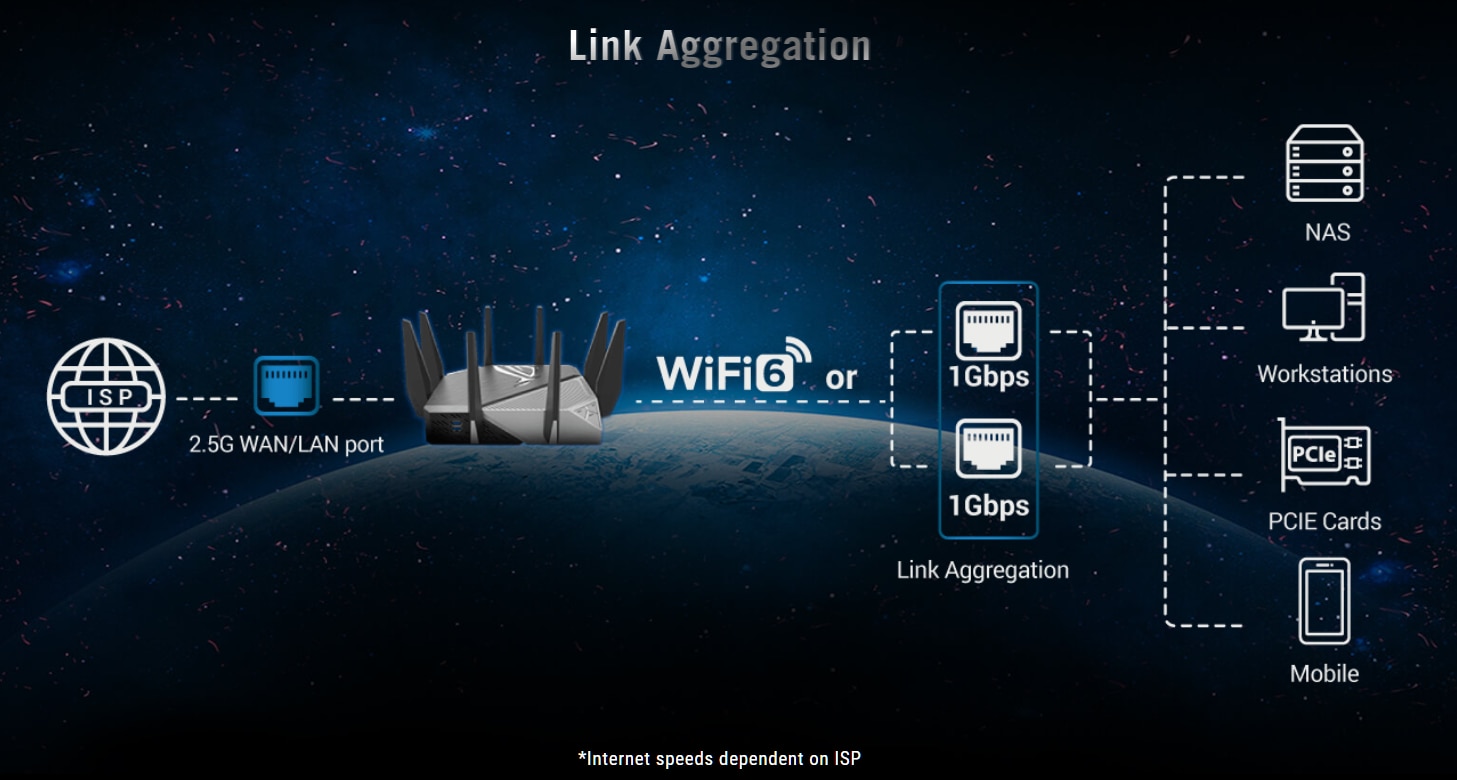 ROG Rapture GT-AXE11000 va ofera mai multe optiuni de conectare la retea. In functie de ISP sau de tipul diferit de modem pe care il utilizati, puteti alege intre un port WAN/LAN de 2,5G sau doua porturi de 1Gbps pentru a obtine cea mai rapida experienta WiFi posibila.