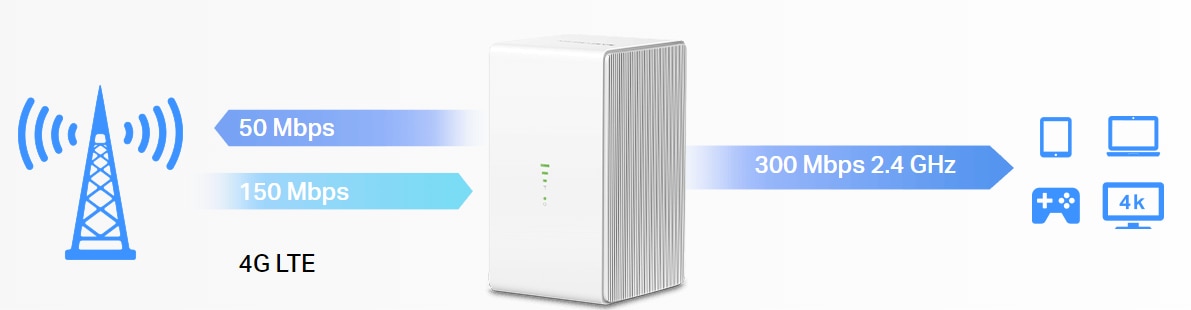 Viteza 4G LTE pentru o conectivitate Wi-Fi fiabila Ca router 4G, MB110-4G utilizeaza tehnologia 4G LTE pentru a obtine viteze foarte rapide de pana la 150 Mbps la descarcare si 50 Mbps la incarcare. De asemenea, poate partaja o retea Wi-Fi cu o viteza maxima de 300 Mbps in 2,4 GHz pentru jocuri, streaming si multe altele. |