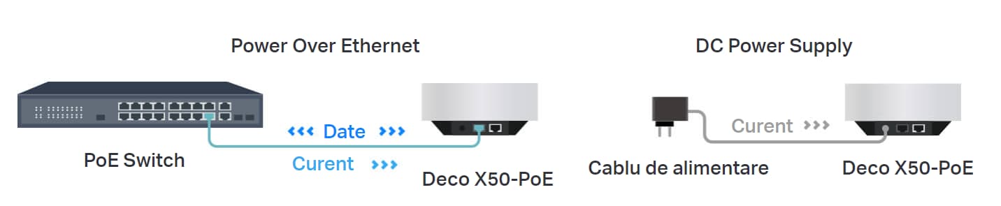 Instalare simplificata a retelei Deco X50-PoE este proiectat sa utilizeze un singur cablu Ethernet atat pentru transmisia de date, cat si pentru alimentarea cu energie. De asemenea, accepta sursa de alimentare DC (cablu de alimentare inclus) pentru instalatii flexibile. |
