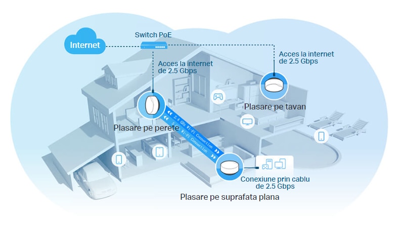 Pentru a-ti acoperi intreaga casa cu semnal Wi-Fi, unitatile Deco X50-PoE lucreaza impreuna pentru a forma o retea mesh unificata, cu un singur nume si parola, pentru a transmite semnalul inspre fiecare colt. |