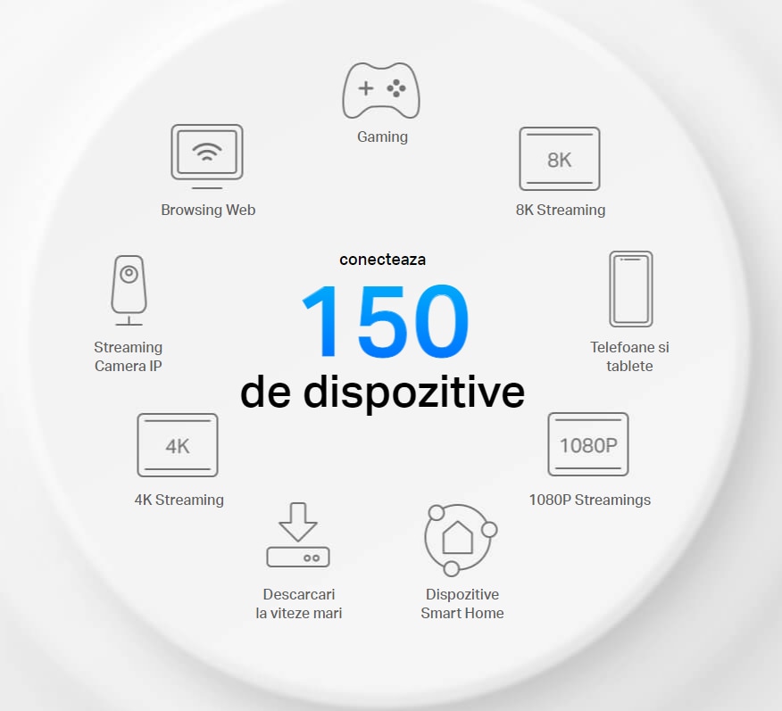 Mai multe conexiuni simultan Poti conecta un numar mare de dispozitive la reteaua ta Wi-Fi mesh, iar acestea vor avea parte de o conexiune rapida si stabila. |
