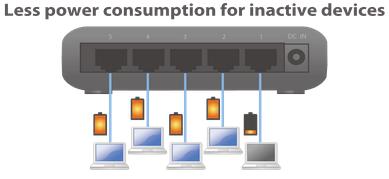 Detectarea legăturii inactive: Când un dispozitiv din reţea este oprit şi/sau legătura cu el este detectată ca fiind inactivă, caracteristica de reglare a consumului energetic reduce automat consumul. Consumul energetic al switch-ului va fi reglat dinamic în funcţie de starea legăturii şi de numărul de dispozitive active din reţea.