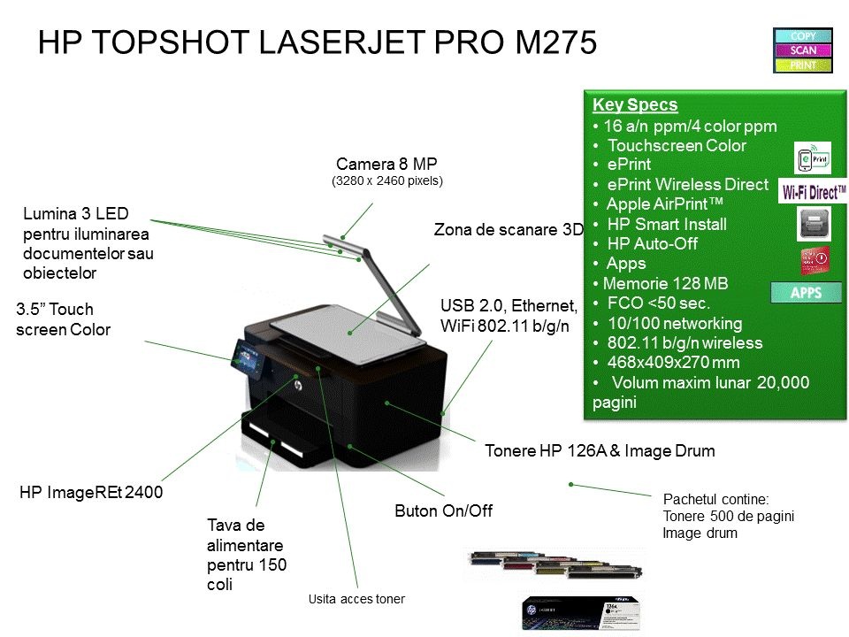 In loc de a beneficia de clasicul scaner cu sticla (plat) sau cu alimentator de documente (ADF), noul multifunctional laser color HP TopShot M275 beneficiaza de o camera foto de mare calitate, montata pe un brat ridicat deasupra zonei de scanare, care realizeaza fotografii ale obiectelor tridimensionale, reproducandu-le in cele mai mici detalii, inclusive perceptia de profunzime si inaltime a acestora.