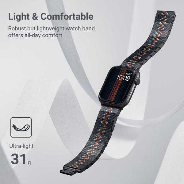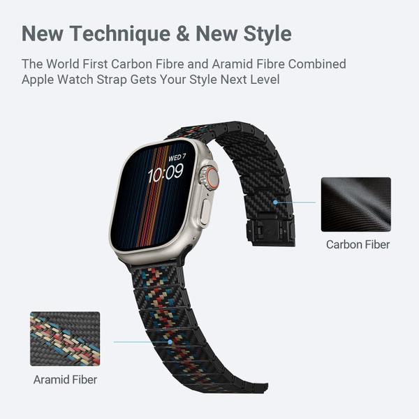 Prima curea de ceas din lume cu legaturi din fibra de carbon si fibra de aramida, compatibila cu toate modelele Apple Watch, inclusiv Series 9-1, SE si Ultra 2/Ultra.