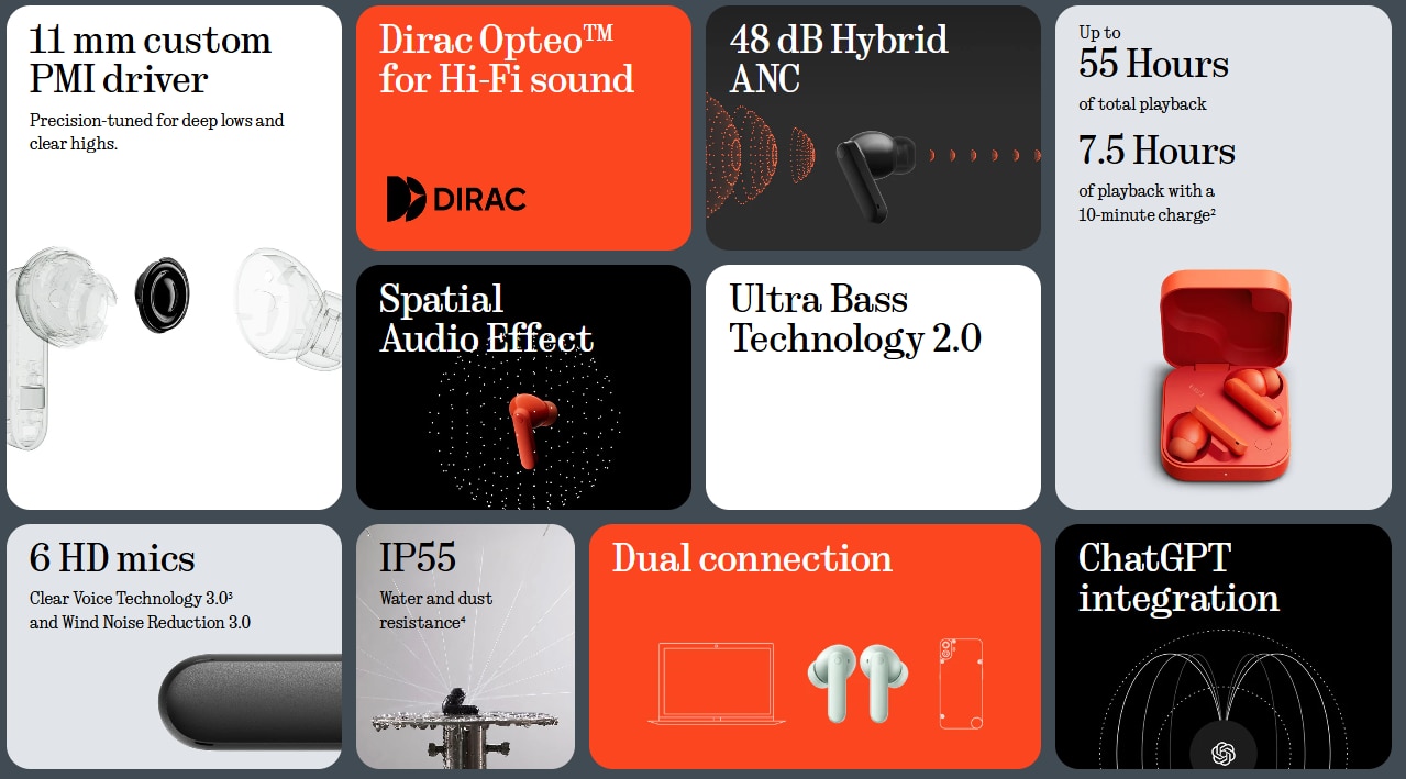 Un companion de zi cu zi care este la fel de dinamic ca tine. CMF Buds 2 sunt create pentru un sunet puternic, de inalta fidelitate, cu 48dB Hybrid ANC, sunet Dirac™-tuned si durata de viata a bateriei pe tot parcursul zilei.
