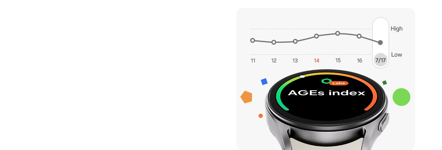 O dietă sănătoasă este cheia, dar de unde știi dacă funcționează? Indicele AGEs este un indicator al sănătății tale metabolice, afectat de dieta și stilul tău de viață. Galaxy Watch7 îți măsoară indicele AGEs în timpul somnului, permițându-ți să verifici rezultatele chiar de pe încheietura mâinii. Urmărește-ți dieta, îmbunătățește-ți stilul de viață și trăiește o viață tânără și sănătoasă.