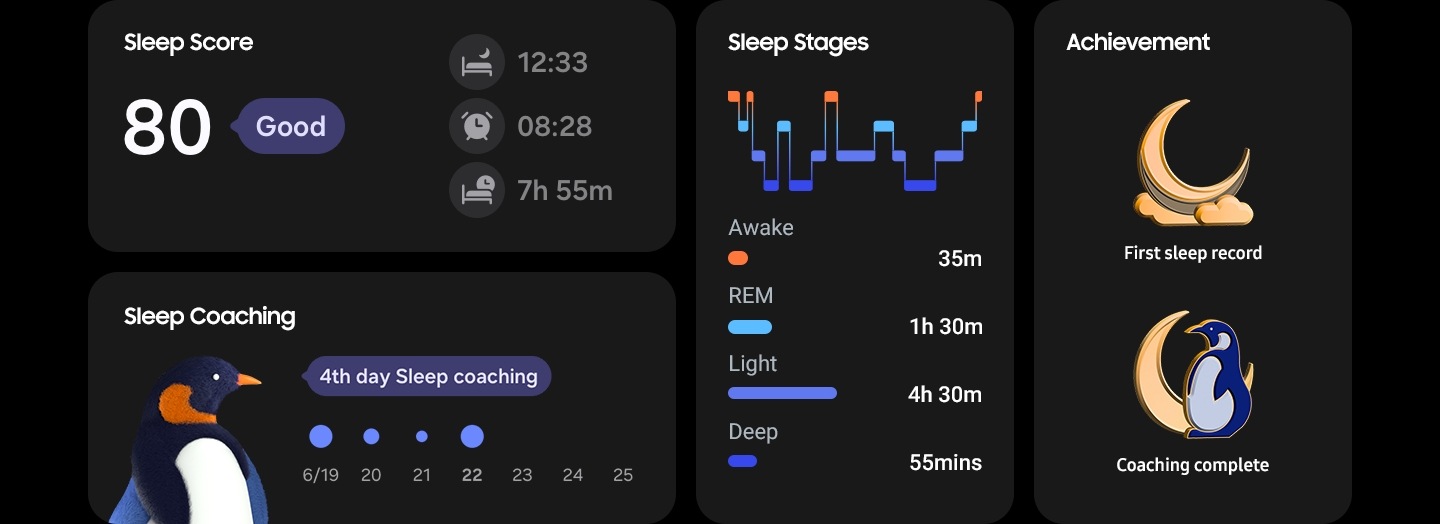 * Necesită versiunea 6.24 sau mai recentă a aplicației Samsung Health.** Galaxy Watch FE trebuie să fie asociat cu un smartphone Samsung Galaxy cu Android 11.*** Funcțiile de monitorizare a somnului sunt destinate numai scopurilor generale de sănătate și fitness. Nu sunt destinate utilizării în detectarea, diagnosticarea, tratamentul oricărei afecțiuni medicale sau tulburări de somn. Măsurătorile sunt doar ca referință personală. Te rugăm să consulți un medic pentru sfaturi.**** Sleep Coaching necesită date despre somn din cel puțin 7 zile, inclusiv 2 zile libere.***** Imagine simulată în scopuri ilustrative. UX/UI reală poate fi diferită.