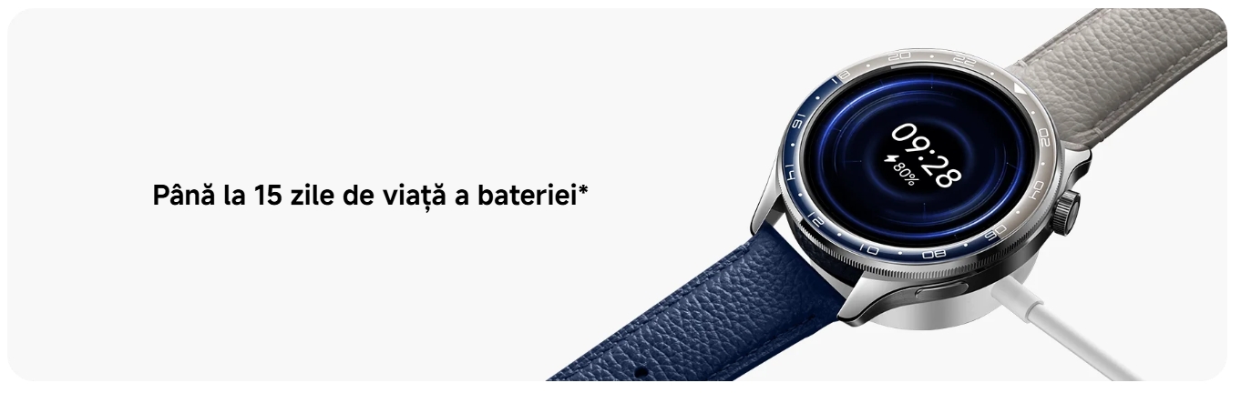 O durată lungă de viață a bateriei de 15 zile* asigură mai mult de 2 săptămâni de utilizare, deci nu este nevoie să aduceți încărcătorul de ceas pentru călătorii pe termen scurt.