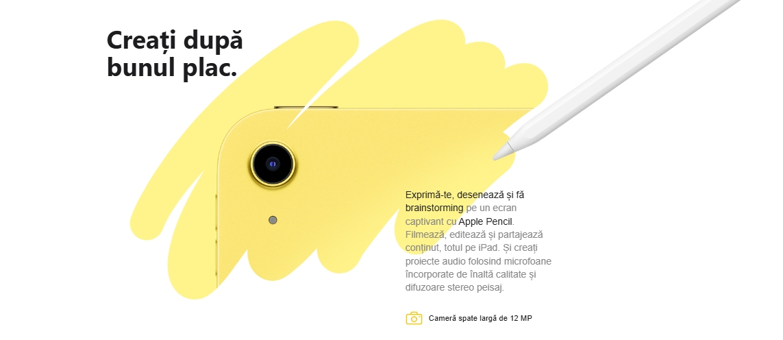 Descrierea produsului Tableta Apple iPad 11 (A16) Cellular, Procesor A16 Penta-Core, Liquid Retina IPS 11", 128GB Flash, Camera 12MP, Wi-Fi, Bluetooth, 5G, iPadOS (Galben)