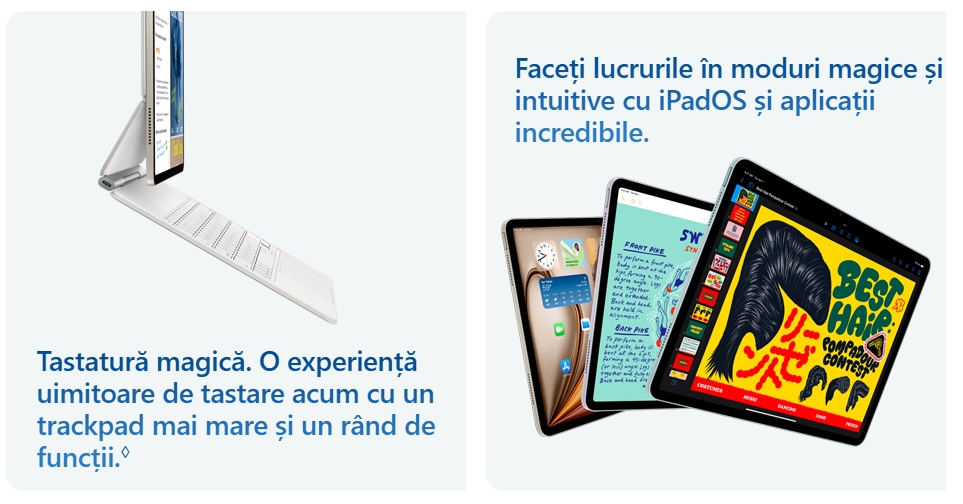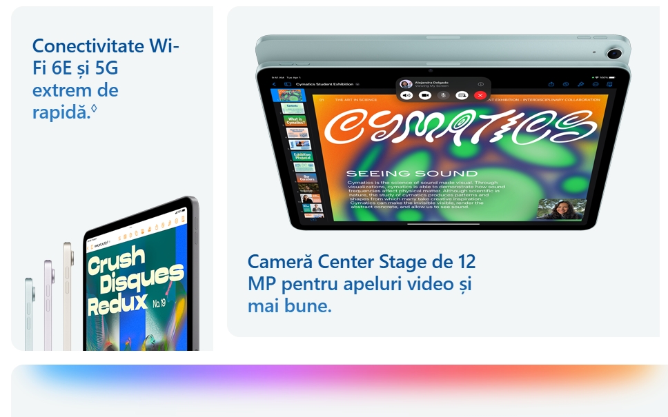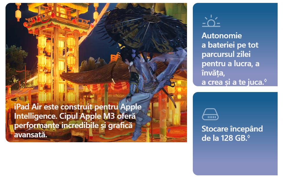 iPad Air frumos proiectat. Două dimensiuni portabile. Cip puternic Apple M3. Construit pentru Apple Intelligence.◊Consultați declinările legale În patru culori uimitoare.