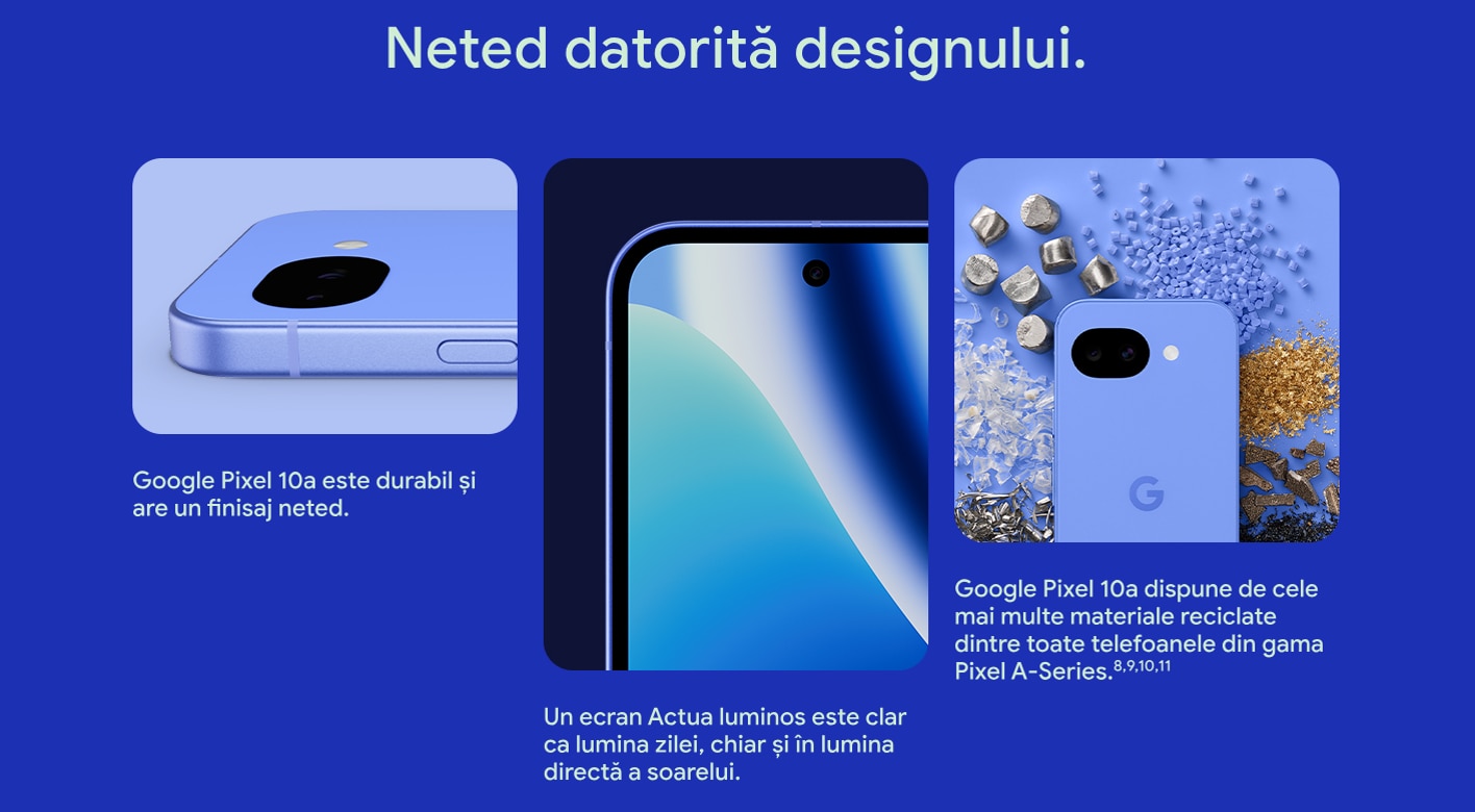 - Google Pixel 10a este durabil si are un finisaj neted.
