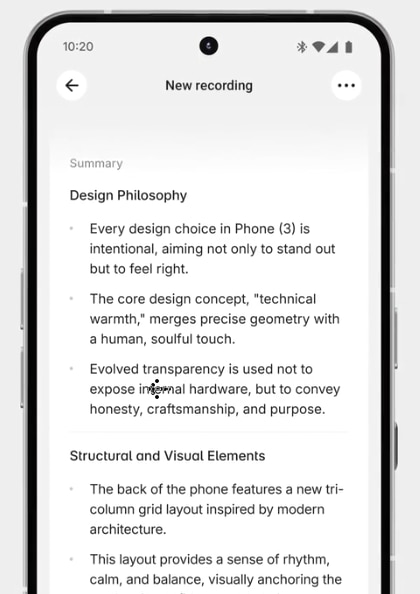 Phone (3) este o celebrare a designului functional si intentionat. Fiecare curba, material si linie are un scop, imbinand caldura tehnologica cu simplitatea remarcabila. Este un stil cu substanta, o celebrare a formei care se imbina cu functia intr-un mod cat se poate de intentionat.