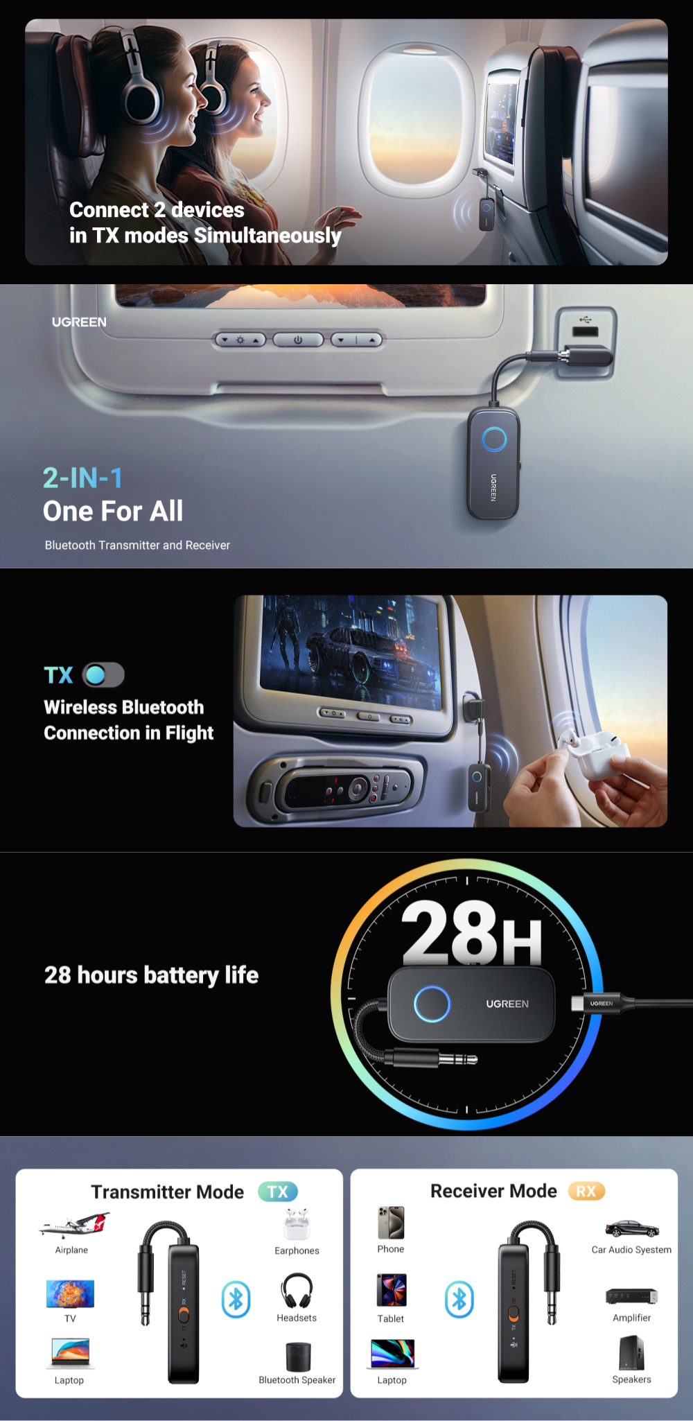 Conectati transmitatorul Bluetooth 5.2 Ugreen in modul TX si transmiteti semnale audio intr-un avion sau cu televizoare care nu accepta Bluetooth catre dispozitive wireless Bluetooth. Vine cu un adaptor AUX cu mufa de 3,5 mm pentru diverse interfete audio pentru avion si o distanta de transmisie de pana la 10 metri, transmitere fara probleme.