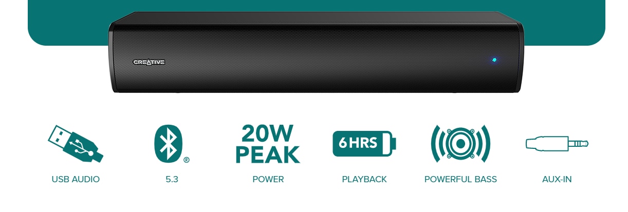 Creative Stage Air V2 vine, de asemenea, cu o baterie reincarcabila incorporata care suporta pana la 6 ore* de redare, astfel incat nu trebuie sa fiti legat de o sursa de alimentare fixa.