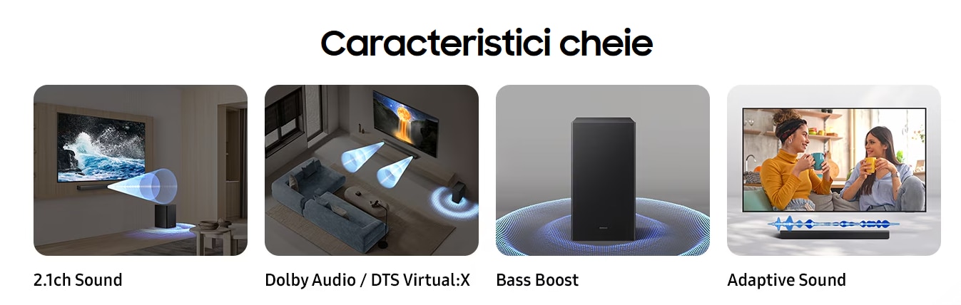 Ai parte de o experienta de ascultare optima pentru fiecare scena. Soundbar-ul recunoaste tipul de continut pe care il vizionezi si adapteaza automat setarile audio, pentru a reproduce voci clare si sunete detaliate.