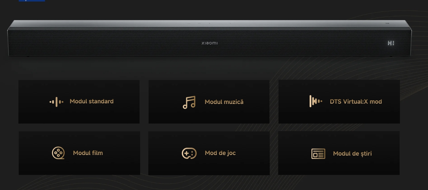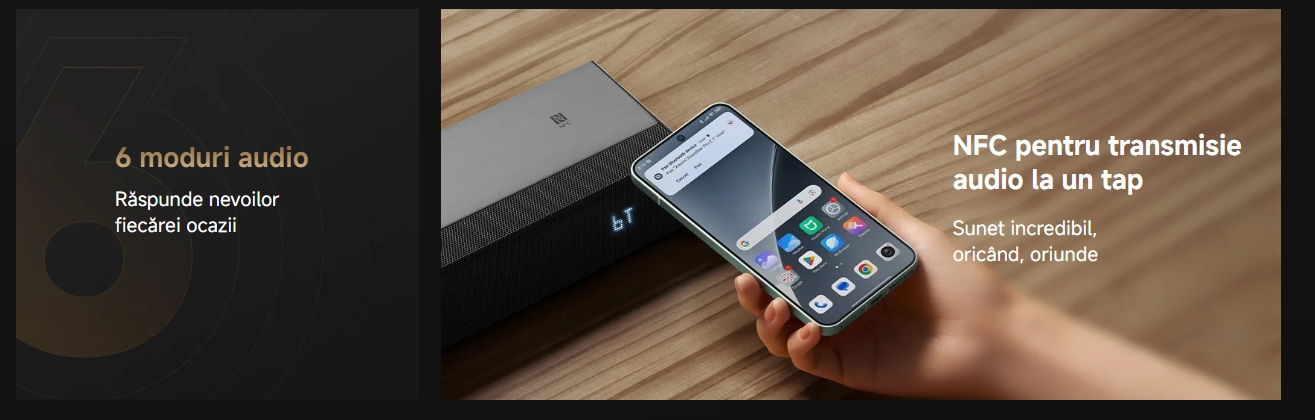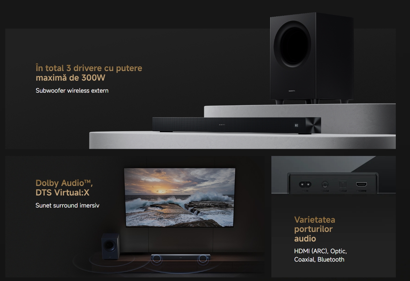 Descrierea produsului Soundbar Xiaomi Pro 2.1 ch QBH4336EU, 300 W, DTS Digital Surround, NFC, Subwoofer Wireless (Negru)