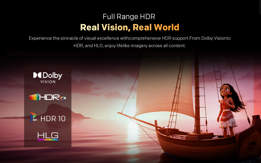 Bucura-te de performanta vizuala suprema, cu suport complet pentru HDR. De la Dolby Vision, la HDR10+ si HLG, toate tipurile de continut prind viata cu imagini naturale si pline de detalii.