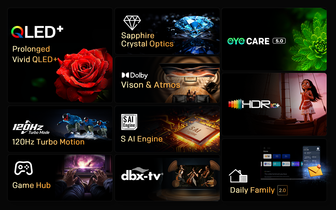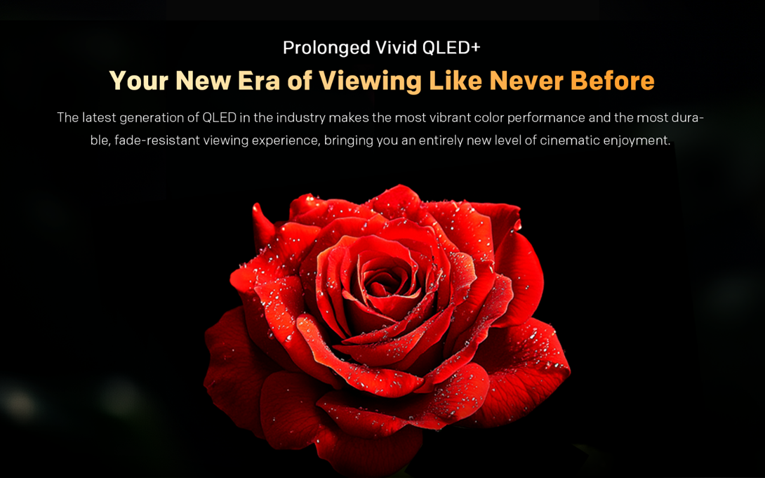 Noua generatie de tehnologie QLED+ ofera cele mai vibrante culori din industrie si o experienta de vizionare durabila, rezistenta la estompare in timp.