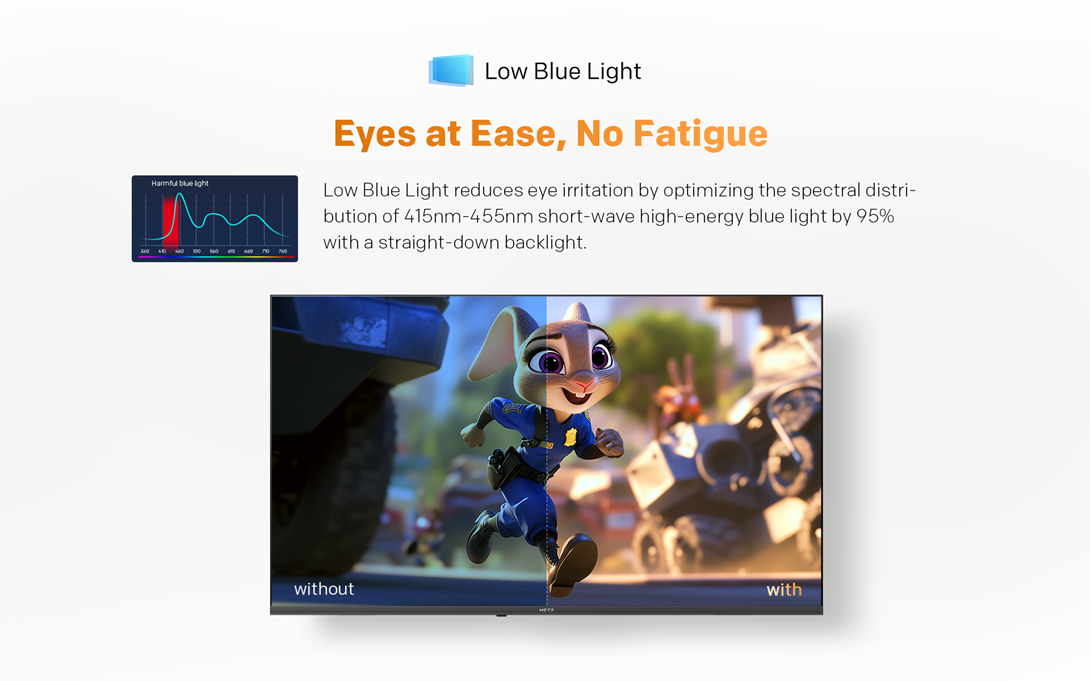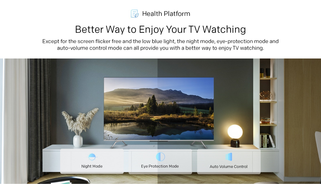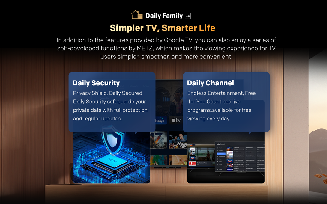 Cu Health Platform de la METZ, va bucurati de o experienta TV complet optimizata. Fara palpairea ecranului si cu emisii reduse de lumina albastra, aceasta protejeaza sanatatea ochilor in mod eficient. In plus, modurile avansate precum modul de noapte, protectia ochilor si controlul automat al volumului sunt concepute pentru a va oferi confort maxim si o vizionare placuta in orice moment al zilei.