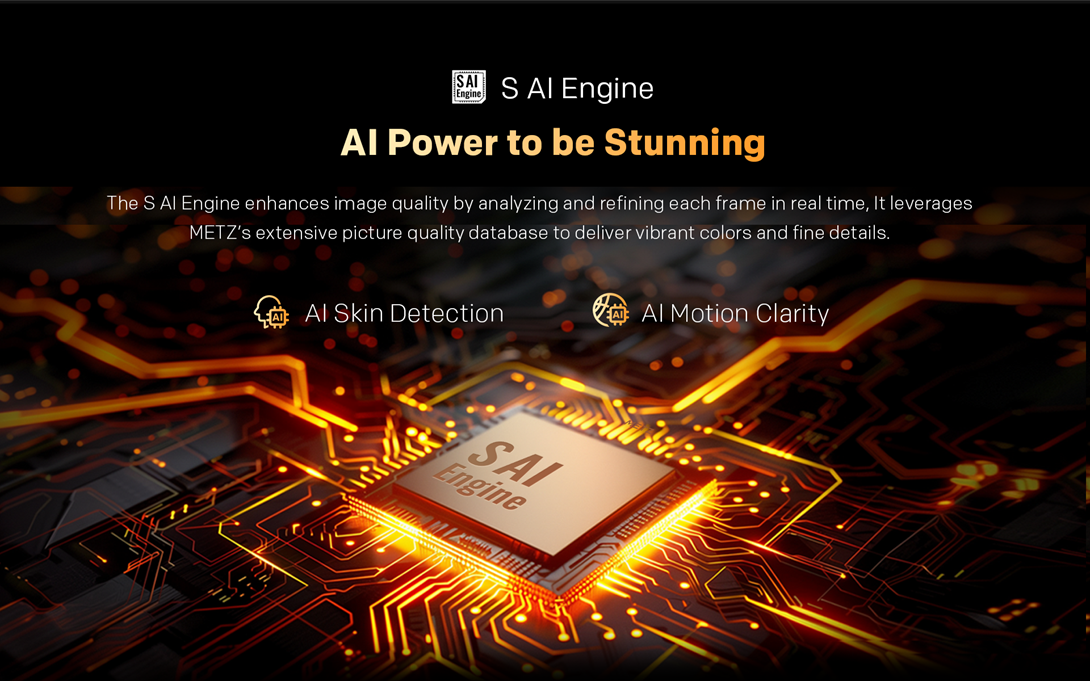 Procesorul inteligent S AI Engine imbunatateste calitatea imaginii analizand si optimizand fiecare cadru in timp real. Foloseste vasta baza de date METZ privind calitatea imaginii pentru a reda culori vibrante si detalii fine, exact asa cum ar trebui sa le vezi.
