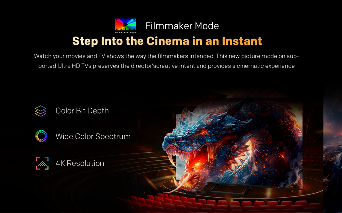 Urmareste filmele si serialele exact asa cum si-au dorit regizorii. Acest mod de imagine nou, disponibil pe televizoarele Ultra HD compatibile, pastreaza intentia creativa a regizorului si ofera o experienta cinematografica autentica.