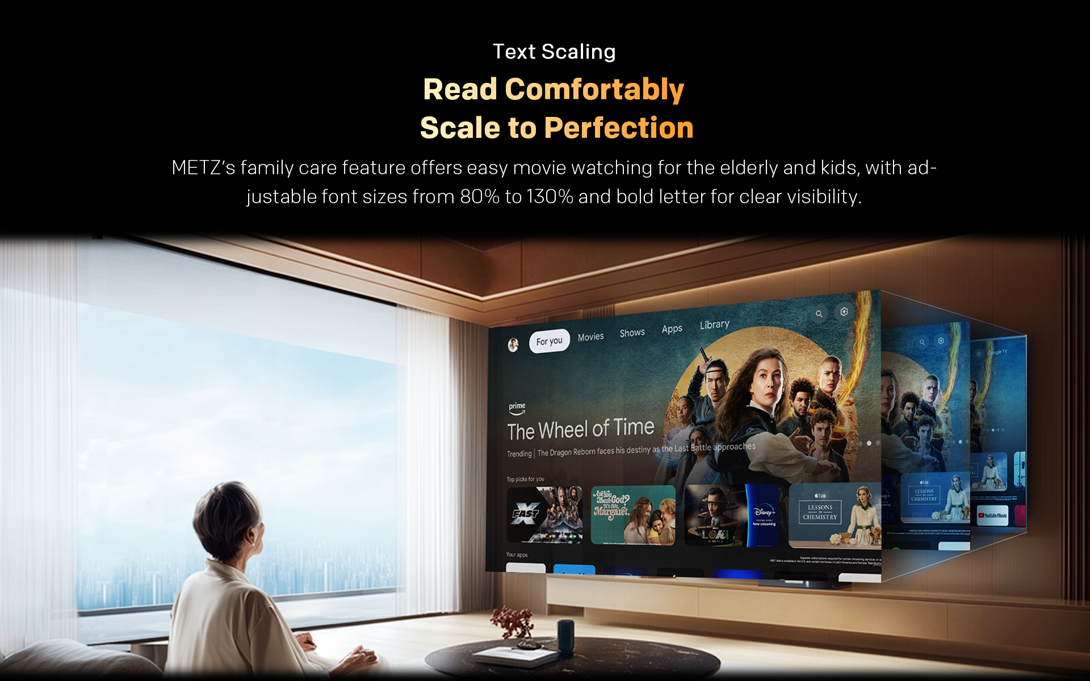 Functia Family Care de la METZ faciliteaza vizionarea filmelor pentru copii si persoane in varsta, oferind posibilitatea de a ajusta marimea textului intre 80% si 130%, cu optiunea de font ingrosat pentru o vizibilitate clara si usoara.