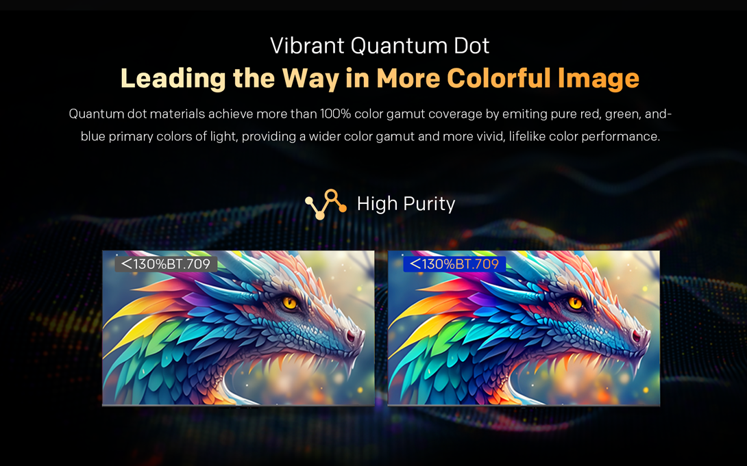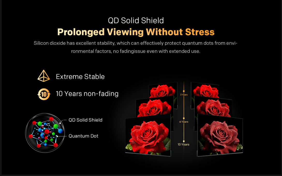 Stratul protector pe baza de dioxid de siliciu ofera o stabilitate exceptionala, protejand eficient punctele cuantice (Quantum Dot) impotriva factorilor de mediu. Culorile raman intense si vii, fara decolorare, chiar si dupa ani de utilizare.