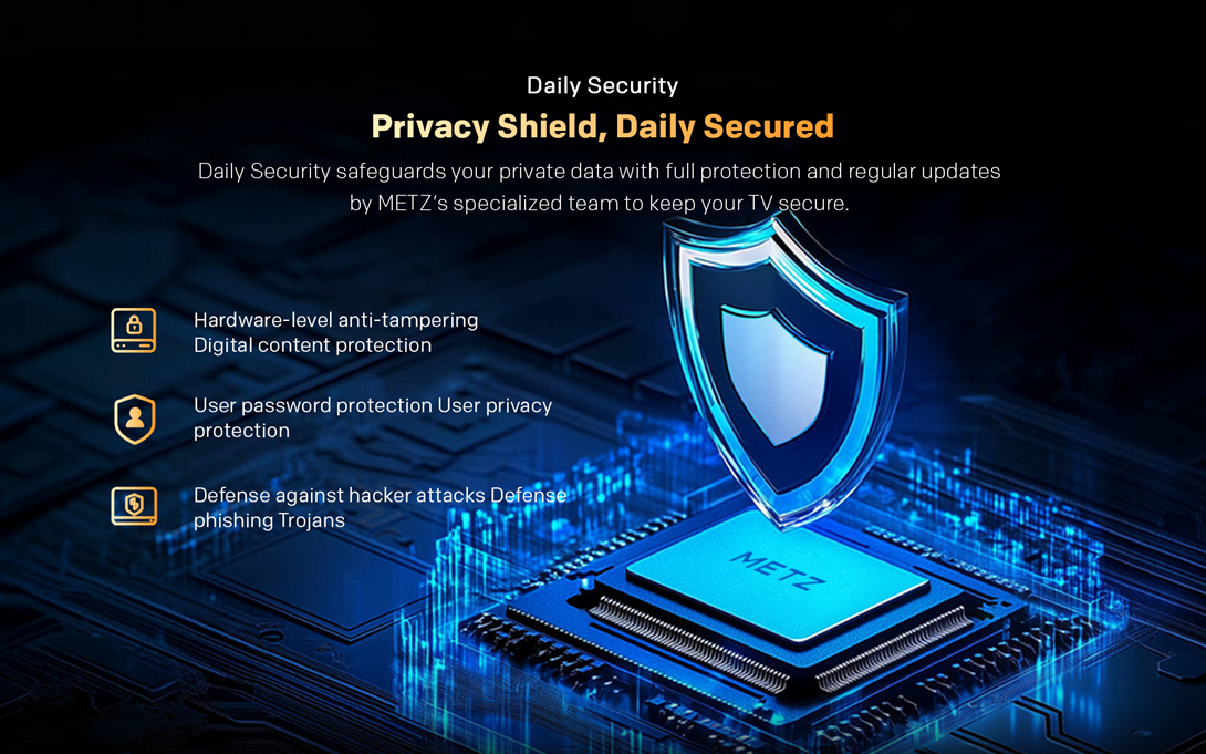 Securitatea zilnica iti protejeaza datele personale cu masuri complete si actualizari regulate, oferite de echipa specializata METZ, pentru ca televizorul tau sa fie mereu in siguranta.